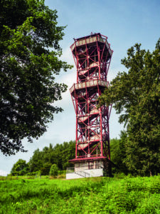 Teren grodziska można oglądać z 44-metrowej wieży widokowej
