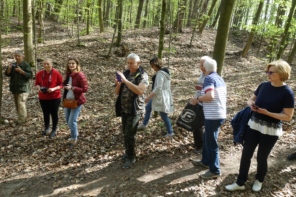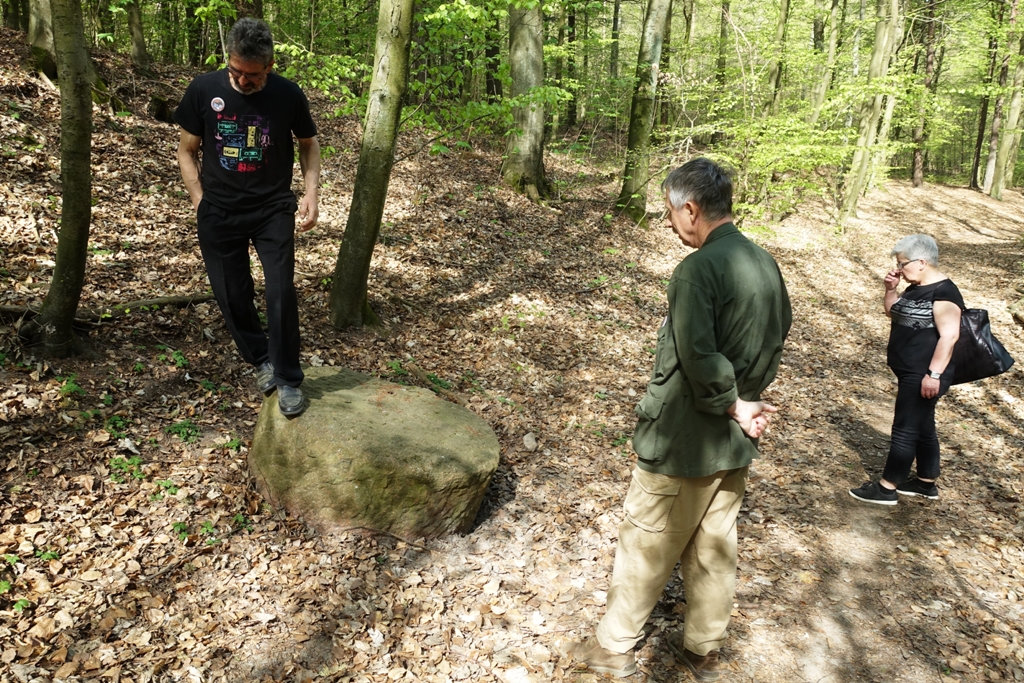 Kolejnym punktem zlotu była wyczerpująca podróż prowadzona krętymi ścieżkami po trudnym i pagórkowatym terenie kompleksów leśnych Kępy Oksywskiej. W czasie wędrówki wysłuchano legendy o zaklętym zamku oraz historii o dwóch istniejących w okolicy wiatrakach (młynach). Ciekawostką i niespodzianką dla wszystkich było znalezienie na brzegu ścieżki dużego, dawnego kamienia młyńskiego. Po kilku kilometrach marszu dotarto dębogórskiej Tajnej Organizacji Woskowej „Gryf Kaszubski”. Powstała w 1943 r. grupa składała się z 13 partyzantów i 5 łączników. Nie prowadziła działań zbrojnych, ale gromadziła informacje o ruchach okolicznych niemieckich wojsk. Ukrywała też miejscowych mieszkańców, przewidzianych do wcielenia w szeregi niemieckiej armii oraz polskich uciekinierów, wcześniej przymusowo do niej wcielonych. Szczęśliwie wszystkim partyzantom z tej grupy udało się przeżyć wojnę, więc w dowód wdzięczności, postawili oni w 1947 roku dziękczynną kapliczkę na skraju drogi w Dębogórzu – Wybudowanie. Obok pozostałości po ziemiance, w 2008 roku, z inicjatywy Tadeusza Krzysztofa i Zrzeszenia Kaszubsko – Pomorskiego Oddziału w Dębogórzu umieszczono okazały głaz, z okolicznościową tablicą informacyjną poświęconą partyzantom. Obok niego, na drzewie, ulokowano również kapliczkę nadrzewną. W tym miejscu uczestnicy wycieczki wysłuchali informacji o historii TOW „Gryf Pomorski”, którą przedstawił autor tego artykułu. Informacja ta wywołała wiele dyskusji, które prowadzono w drodze powrotnej do miejsca zlotu.